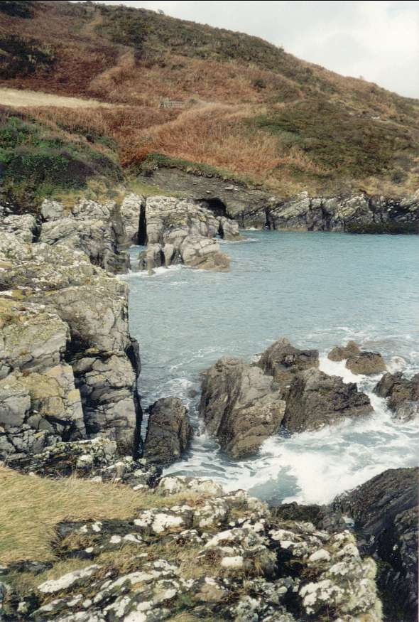 Blick zurück auf Steilküste mit vielen Klippen und Höhlen