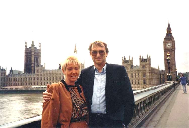 London: Wir auf der Westminster Bridge, hinter uns das Parlamentsgebäude und Big Ben mit Westminster Hall